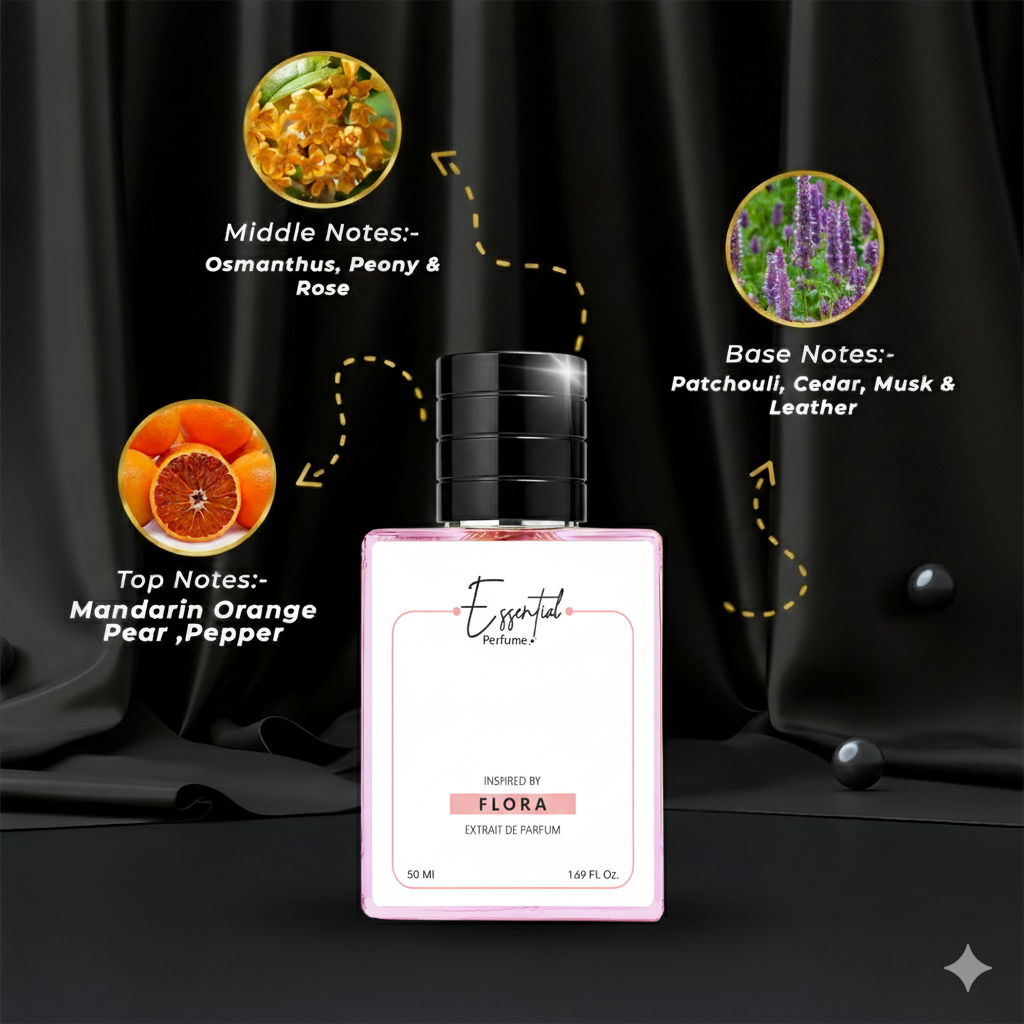 flora gorgeous for women is a joyful floral perfume. Top note is Mandarin and pepper ; middle note is Osmanthus, peony and rose ; base note is Patchouli, cedar and leather .